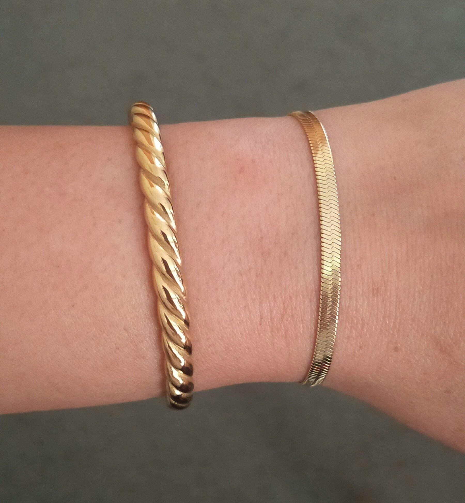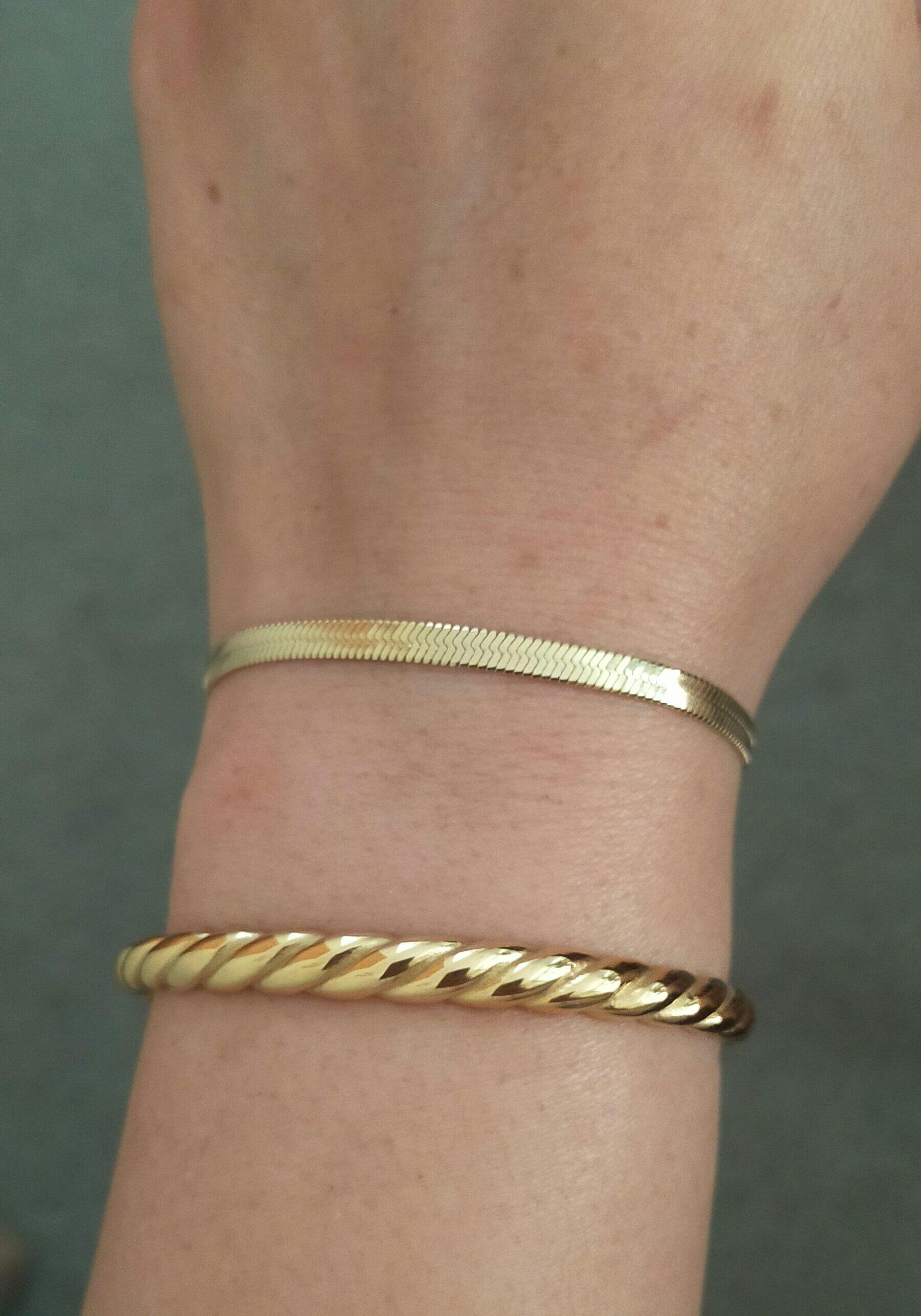 I absolutely love this bangle! The twisted design is elegant yet simple, making it easy to wear with both casual and dressy outfits. The gold tone is rich and vibrant without looking too flashy, and it feels sturdy and well-made. It sits comfortably on my wrist and pairs perfectly with my watch or on its own. Definitely a timeless piece I’ll be reaching for every day.