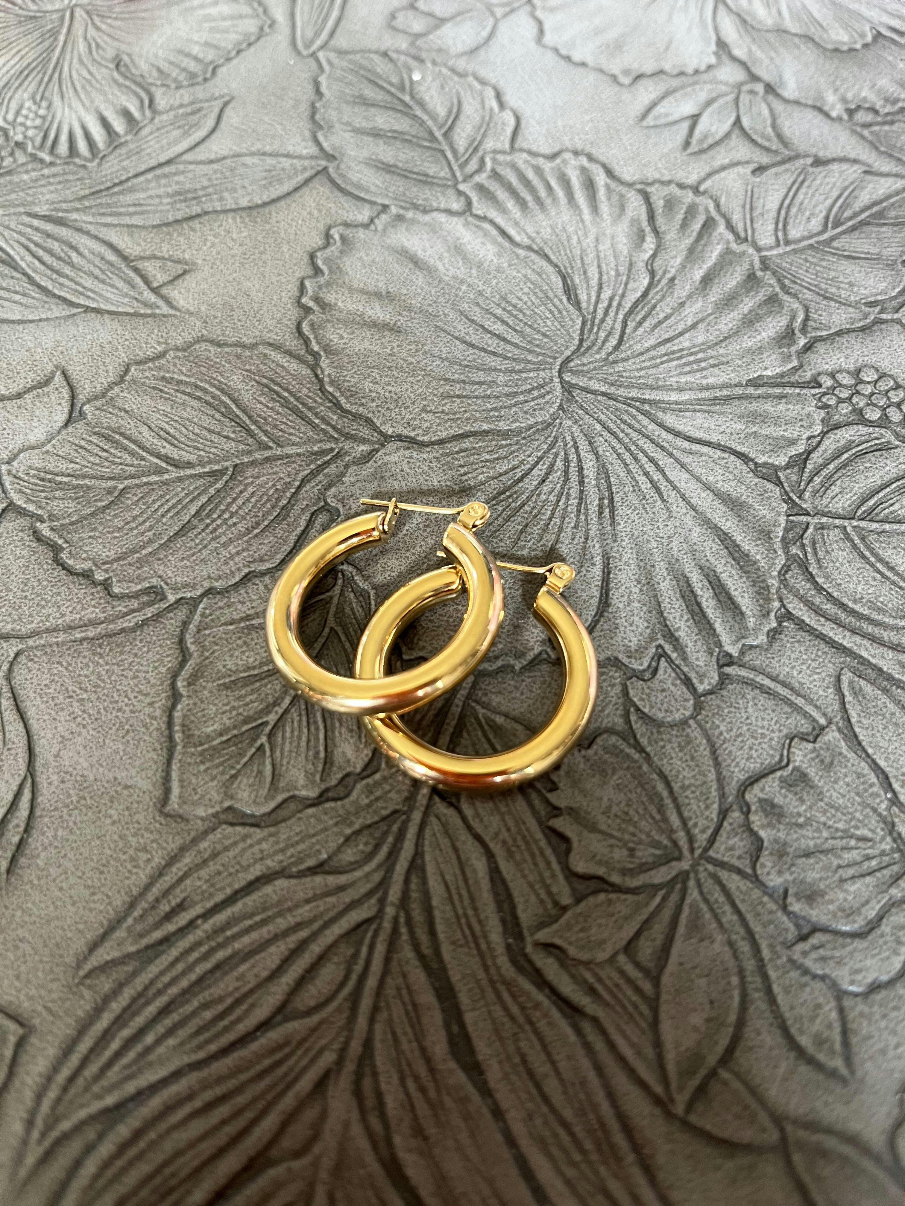 Your new everyday essential. These classic gold hoops are the perfect blend of bold and timeless — with a smooth, rounded shape that goes with literally everything. Lightweight, effortless, and always in style.